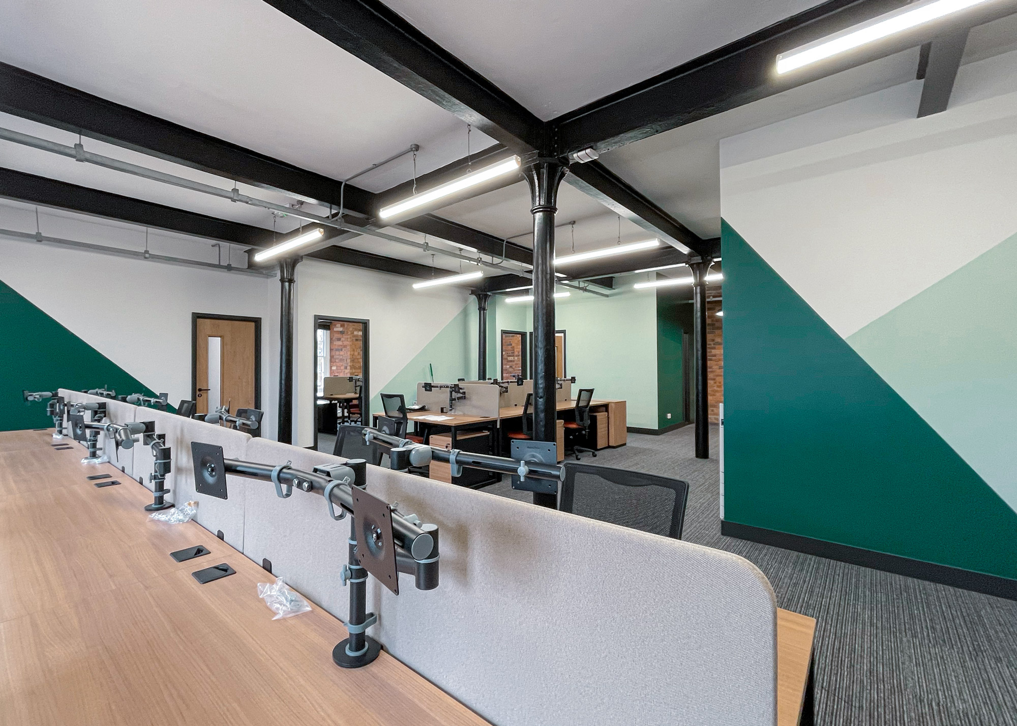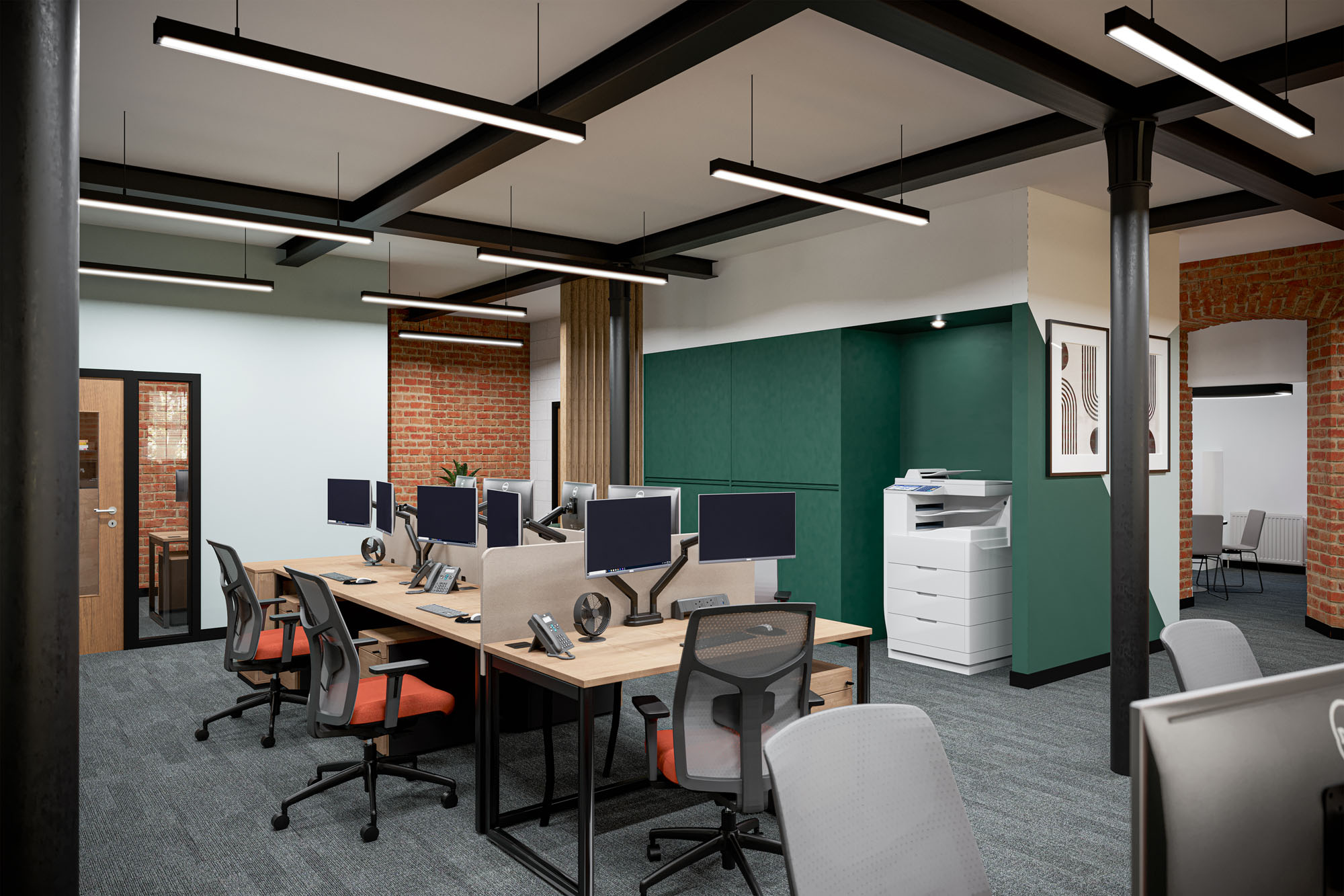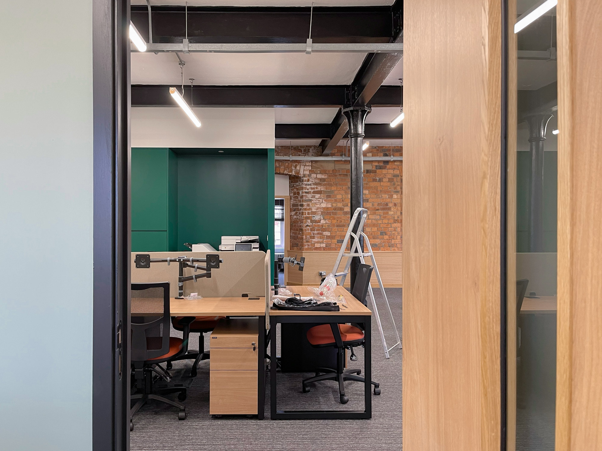 As certain elements within the building were listed, we had to carefully rework the layout to suit the client’s needs, as well as being sympathetic to the existing structure. With careful planning, we created different zones including; an open plan office, dedicated printer area with ample storage and a small kitchenette with breakout room adjacent – the perfect spot for staff to take a break.