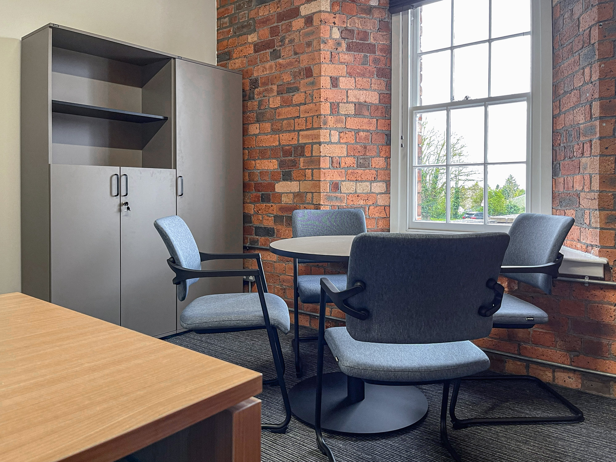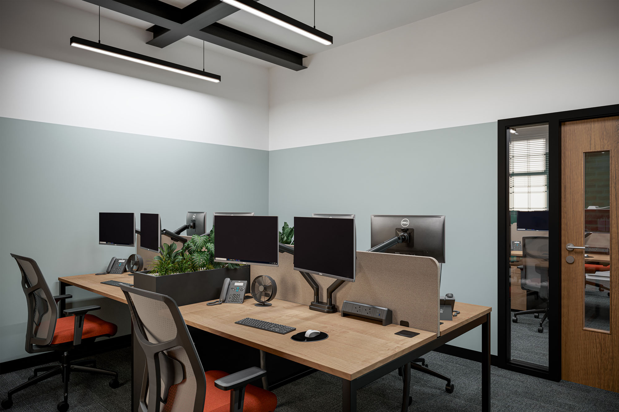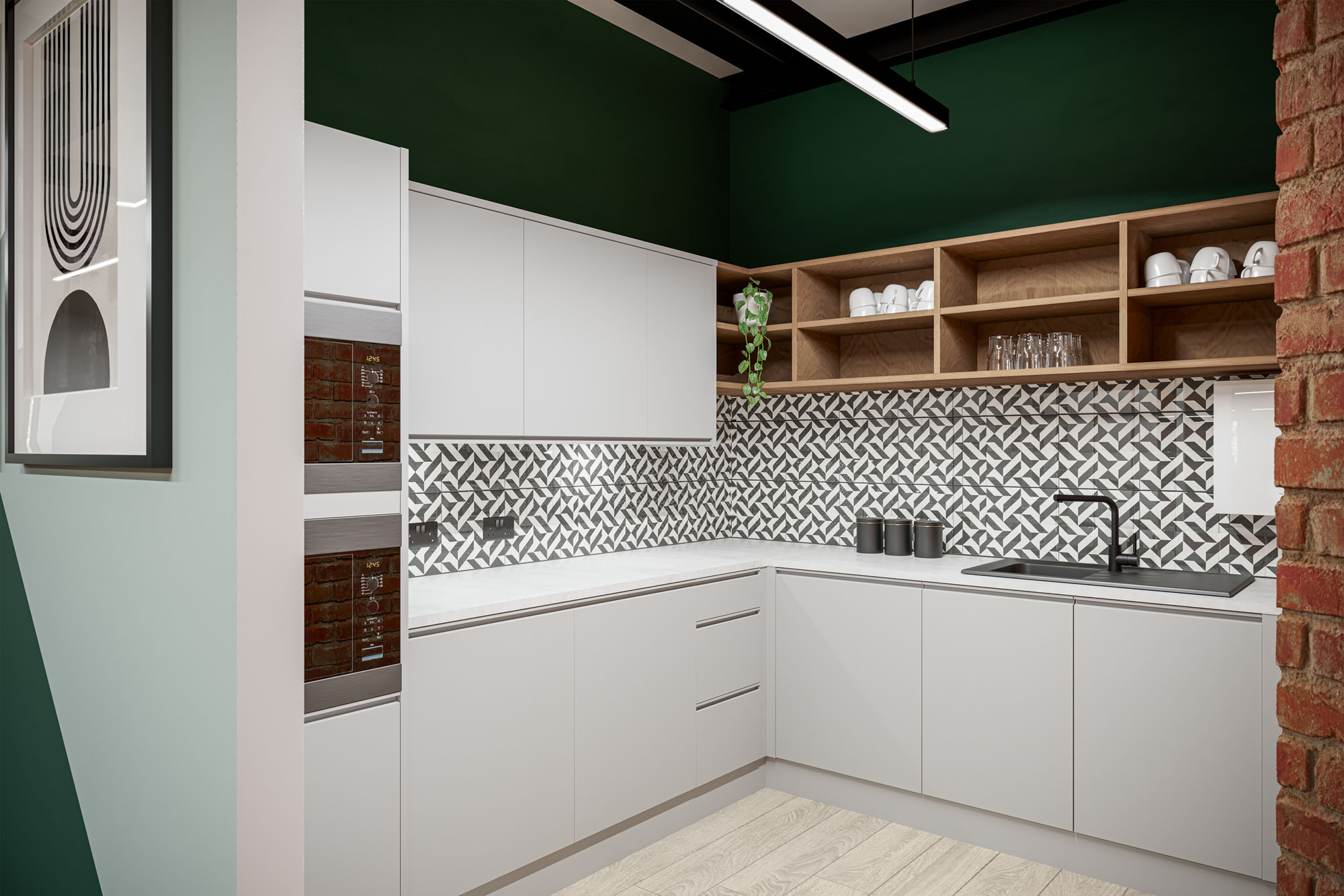As certain elements within the building were listed, we had to carefully rework the layout to suit the client’s needs, as well as being sympathetic to the existing structure. With careful planning, we created different zones including; an open plan office, dedicated printer area with ample storage and a small kitchenette with breakout room adjacent – the perfect spot for staff to take a break.