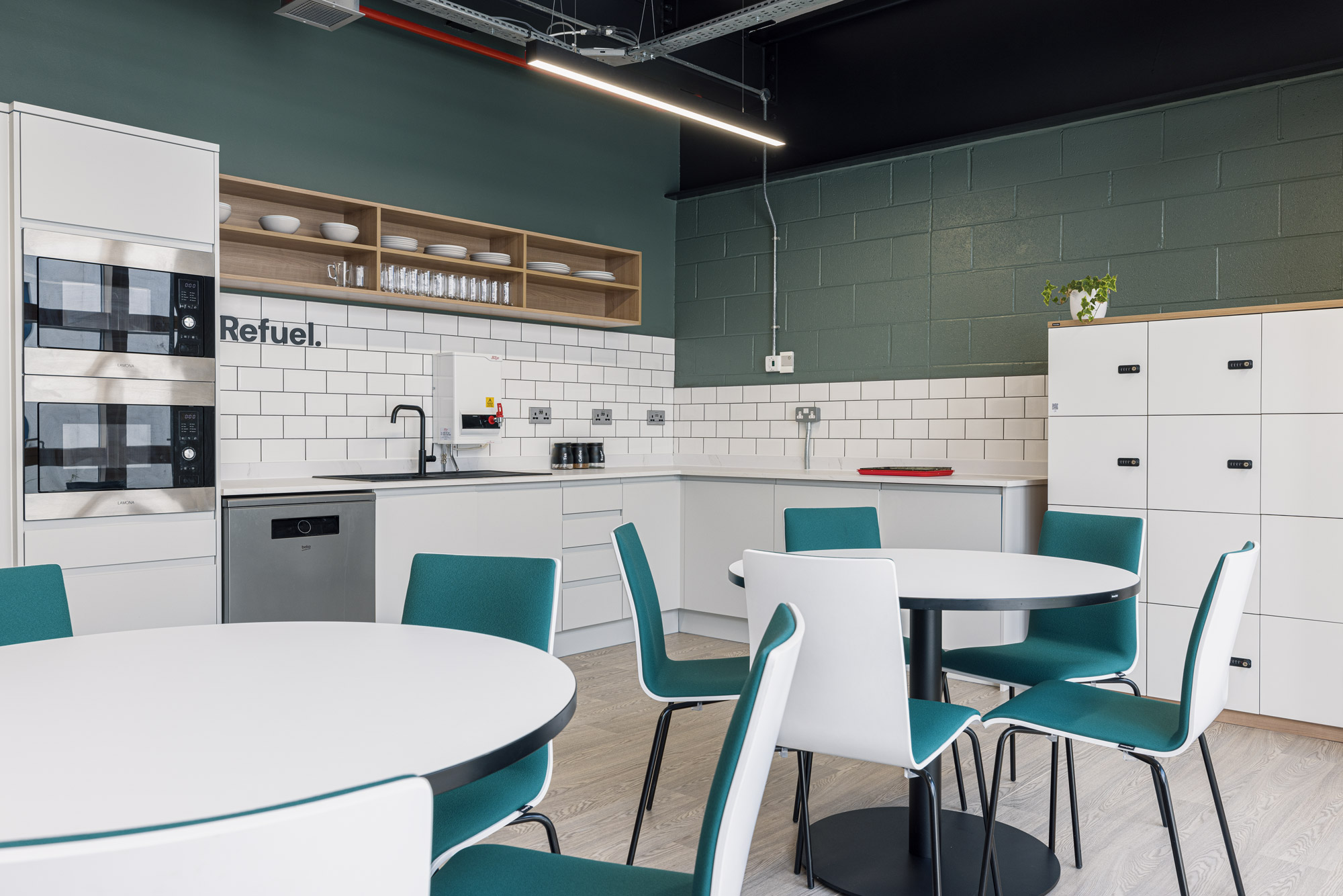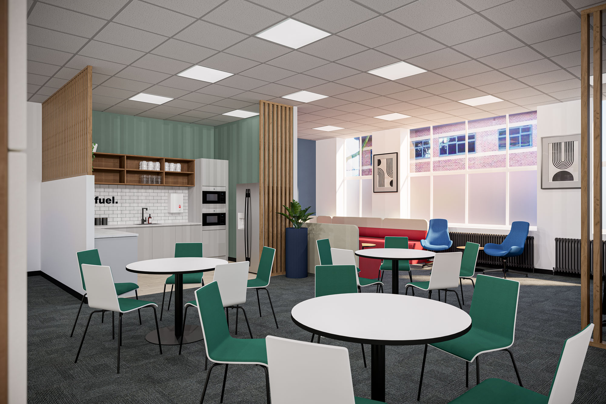 The design included strategically planned zones to accommodate diverse activities within the staff rooms. These included: Soft seating areas for relaxation and informal conversations. Modular seating areas that could be used for collaborative work or individual tasks. Desking areas for short, focused work sessions. Table and chair setups for dining and social interactions.