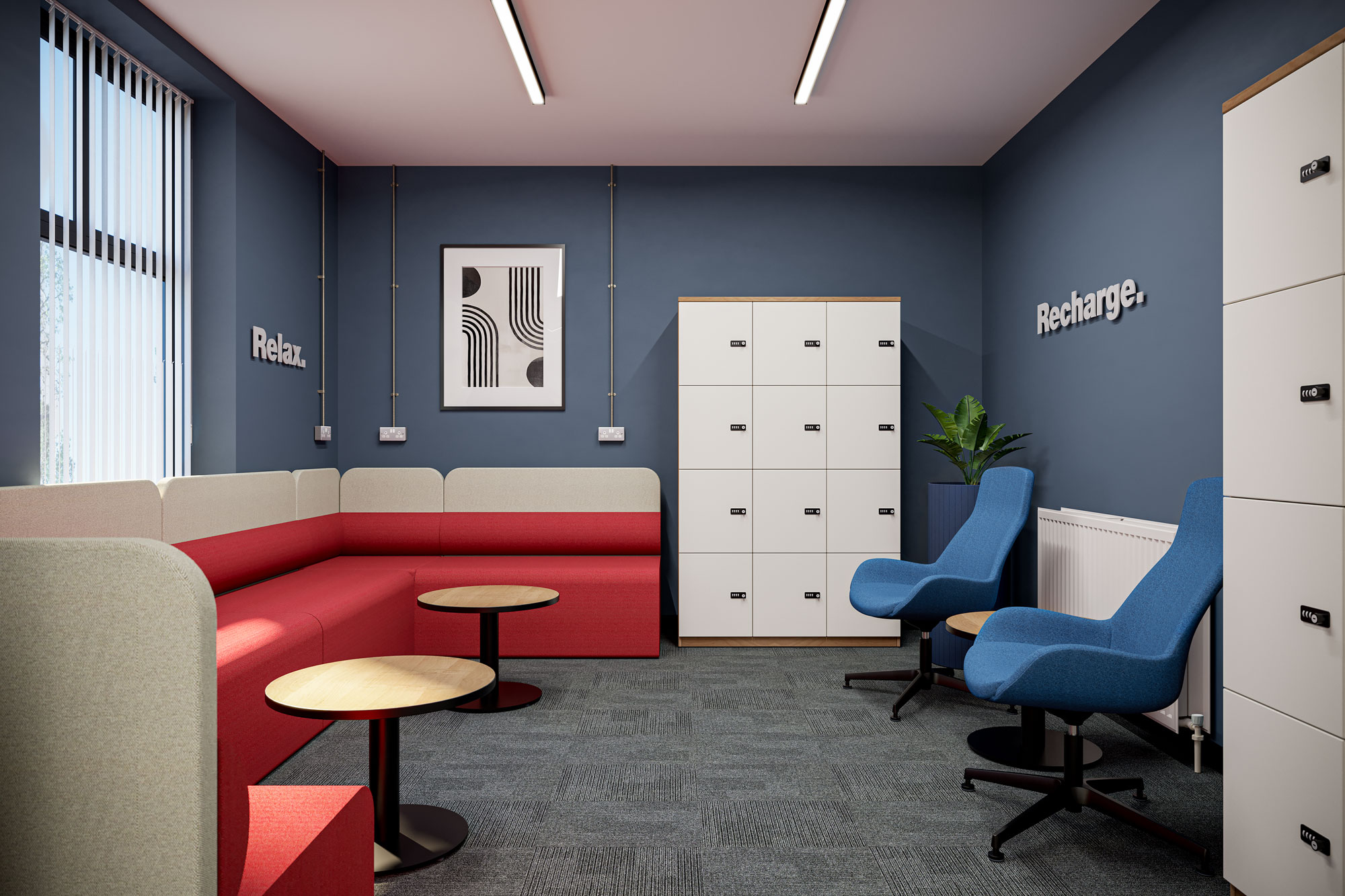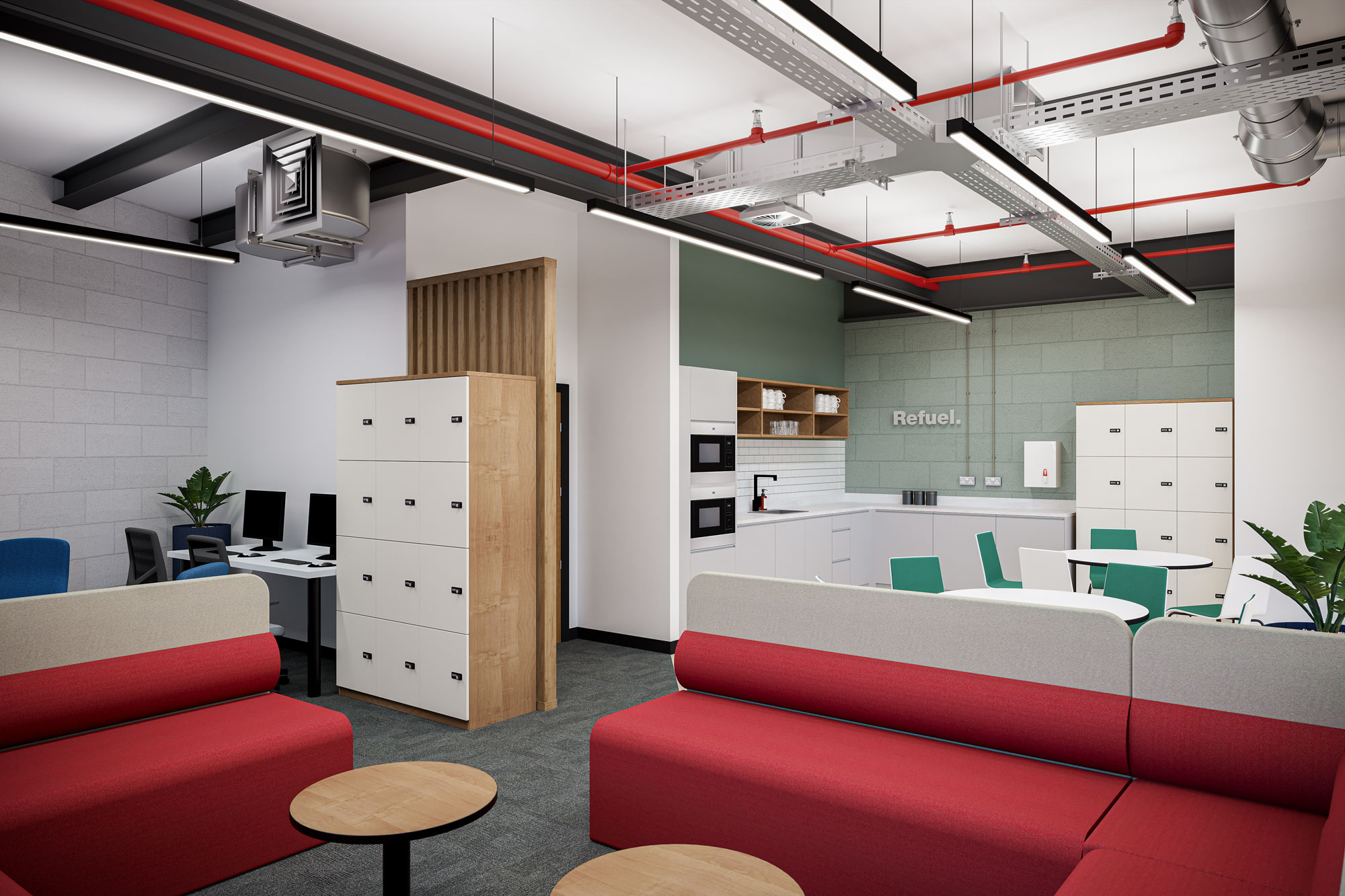 Our team began by developing a comprehensive concept design that addressed both the aesthetic and functional needs of the staff rooms. We created a blueprint that could then be rolled out across all eight staff rooms. The focus was on creating an environment that felt welcoming and rejuvenating, incorporating elements that would foster relaxation and productivity.